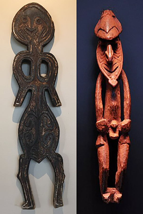 Bioma figures are wood-carved figures from Papua New Guinea that have human forms but represent the spirit of animals, particularly those of wild pigs killed in organized hunts. The pictured work on the left was created by Subhashish Panigrahi.