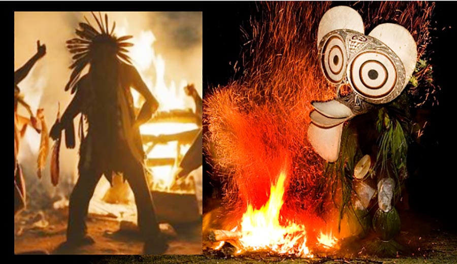 The people of the Baining Mountains create art forms that have a very ephemeral existence. One of these is the dance mask which is laboriously made from bark cloth, bamboo and leaves and used just once for the firedance ceremony before being thrown away or destroyed. The origin of these firedance ceremonies was to celebrate the birth of new children, the commencement of harvests, and also a way of remembering the dead. The Baining fire dance is also a right of passage for initiating young men into adulthood. A totally male event, the fire dance traditionally does not include the Baining women and children.