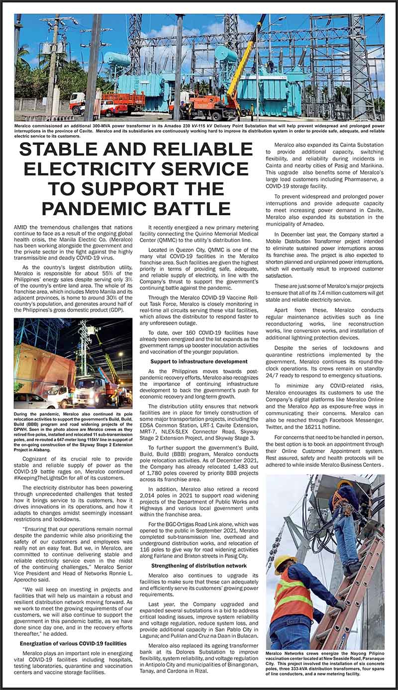 FacebookInstagramTwitterYoutube Wednesday, November 5, 2025 SEARCH Subscribe Home Business Business News World Business Corporate News Market Makers Marketing Board Shipping & Transportation News National News International News Sports Baseball Basketball Billiard Boxing Football Golf Olympics Other Sports Sea Games Tennis Volleyball Lifestyle Arts Columns Fashion Food Health Home Living Entertainment Columns Movies Music/Concert/Shows Spotlight TV/Streaming Opinion Column of the day Editorial Cartoon Editorial Opinion of the day Weekly Features Banking & Finance Torque & Power Alternative Fuel/Electric Vehicles Commercial Vehicles Luxury Cars Motorcycles Test Drives Infotech & Electronics Appliances/Electronics Constructioneering Cybersecurity/Privacy e-Commerce e-Sports/Gaming Fintech/Crypto Gadgets Imaging Printed Circuit Science and Technology Socmed Tech Industry Tech This Week Tech People Property Travel & Tourism Special Features Anniversary Issues 42nd Anniversary Section C Section D Section E Section F Section G Section H 41st Anniversary Supplement 40th Anniversary Report 39th Anniversary Report 38th Anniversary Report Supplements Branded Content Notices 39th Anniversary Report: MERALCO By ___ February 1, 2022 12:30 AM Updated: February 1, 2022 12:30 AM Share FacebookTwitterPinterestWhatsApp Asia Event Group Inc. launches Aftermarket Expo Asia 2025: A premier platform for innovation and growth in the automotive sector October 2, 2025 Fight vs. illegal gambling gets boost with ₱50M PAGCOR grant to NBI October 2, 2025 NUSTAR Online joins as major sponsor of RED Charity Gala 2025, championing fashion, philanthropy, and Filipino ingenuity October 2, 2025 Nestlé Wellness Campus promotes the importance of nutritious breakfast and healthy habits during Better Breakfast Month October 2, 2025 PlayTime CARES: Strengthening communities and supporting Government for nation-building October 2, 2025 Share FacebookTwitterPinterestWhatsApp Previous articleCOVID claims hit P8BNext articleFuel price hike on a five-week streak - Advertisement - - Advertisement - E-Paper More Stories NUSTAR Online joins as major sponsor of RED Charity Gala 2025, championing fashion, philanthropy, and Filipino ingenuity Nestlé Wellness Campus promotes the importance of nutritious breakfast and healthy habits during Better Breakfast Month Load more Related Stories ___ - October 2, 2025Asia Event Group Inc. launches Aftermarket Expo Asia 2025: A premier platform for innovation and growth in the automotive sector ___ - October 2, 2025Fight vs. illegal gambling gets boost with ₱50M PAGCOR grant to NBI ___ - October 2, 2025NUSTAR Online joins as major sponsor of RED Charity Gala 2025, championing fashion, philanthropy, and Filipino ingenuity Load more
