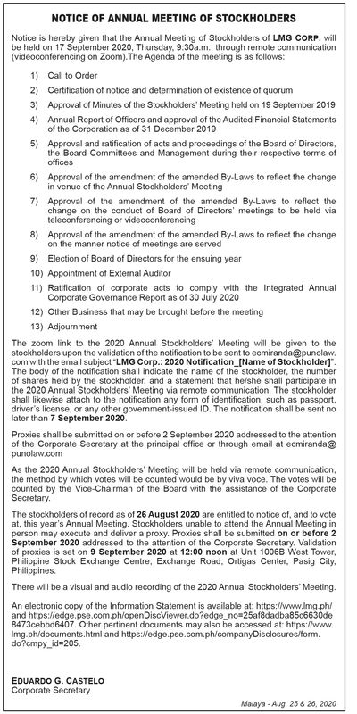 FacebookInstagramTwitterYoutube Tuesday, October 28, 2025 SEARCH Subscribe Home Business Business News World Business Corporate News Market Makers Marketing Board Shipping & Transportation News National News International News Sports Baseball Basketball Billiard Boxing Football Golf Olympics Other Sports Sea Games Tennis Volleyball Lifestyle Arts Columns Fashion Food Health Home Living Entertainment Columns Movies Music/Concert/Shows Spotlight TV/Streaming Opinion Column of the day Editorial Cartoon Editorial Opinion of the day Weekly Features Banking & Finance Torque & Power Alternative Fuel/Electric Vehicles Commercial Vehicles Luxury Cars Motorcycles Test Drives Infotech & Electronics Appliances/Electronics Constructioneering Cybersecurity/Privacy e-Commerce e-Sports/Gaming Fintech/Crypto Gadgets Imaging Printed Circuit Science and Technology Socmed Tech Industry Tech This Week Tech People Property Travel & Tourism Special Features Anniversary Issues 42nd Anniversary Section C Section D Section E Section F Section G Section H 41st Anniversary Supplement 40th Anniversary Report 39th Anniversary Report 38th Anniversary Report Supplements Branded Content Notices LMG CORPORATION: Notice of Annual Meeting of Stockholders By ___ August 26, 2020 1:00 AM Updated: August 26, 2020 1:00 AM Share FacebookTwitterPinterestWhatsApp Asia Event Group Inc. launches Aftermarket Expo Asia 2025: A premier platform for innovation and growth in the automotive sector October 2, 2025 Fight vs. illegal gambling gets boost with ₱50M PAGCOR grant to NBI October 2, 2025 NUSTAR Online joins as major sponsor of RED Charity Gala 2025, championing fashion, philanthropy, and Filipino ingenuity October 2, 2025 Nestlé Wellness Campus promotes the importance of nutritious breakfast and healthy habits during Better Breakfast Month October 2, 2025 PlayTime CARES: Strengthening communities and supporting Government for nation-building October 2, 2025 Share FacebookTwitterPinterestWhatsApp Previous articleColour-coded wristbands guide social distancing in Dubai officeNext articleBringing Bali home: South Koreans indulge in extreme staycationing - Advertisement - - Advertisement - E-Paper More Stories NUSTAR Online joins as major sponsor of RED Charity Gala 2025, championing fashion, philanthropy, and Filipino ingenuity Nestlé Wellness Campus promotes the importance of nutritious breakfast and healthy habits during Better Breakfast Month Load more Related Stories ___ - October 2, 2025Asia Event Group Inc. launches Aftermarket Expo Asia 2025: A premier platform for innovation and growth in the automotive sector ___ - October 2, 2025Fight vs. illegal gambling gets boost with ₱50M PAGCOR grant to NBI ___ - October 2, 2025NUSTAR Online joins as major sponsor of RED Charity Gala 2025, championing fashion, philanthropy, and Filipino ingenuity Load more
