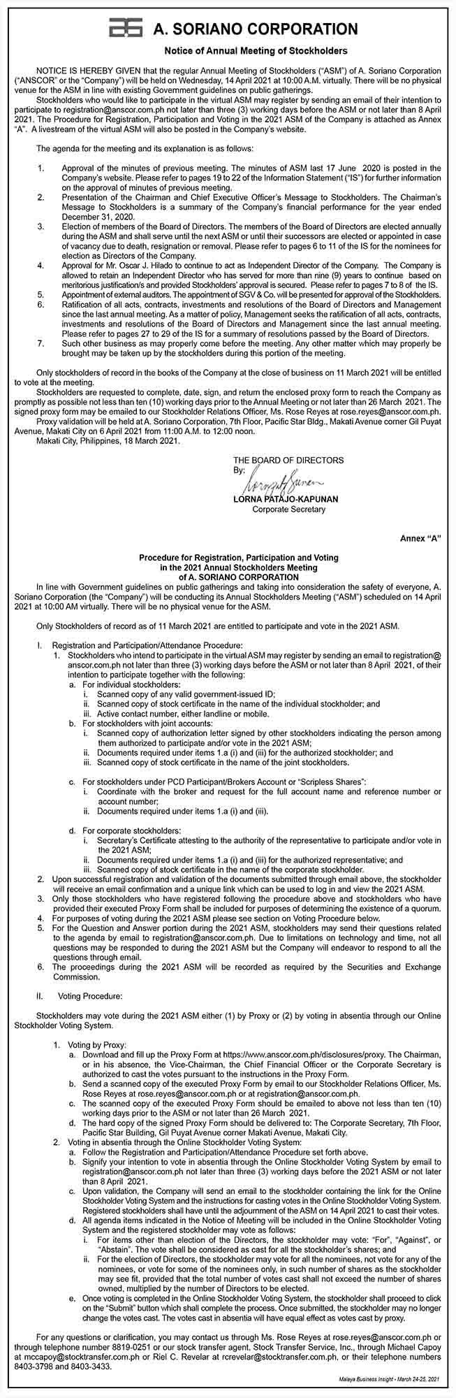 FacebookInstagramTwitterYoutube Saturday, October 25, 2025 SEARCH Subscribe Home Business Business News World Business Corporate News Market Makers Marketing Board Shipping & Transportation News National News International News Sports Baseball Basketball Billiard Boxing Football Golf Olympics Other Sports Sea Games Tennis Volleyball Lifestyle Arts Columns Fashion Food Health Home Living Entertainment Columns Movies Music/Concert/Shows Spotlight TV/Streaming Opinion Column of the day Editorial Cartoon Editorial Opinion of the day Weekly Features Banking & Finance Torque & Power Alternative Fuel/Electric Vehicles Commercial Vehicles Luxury Cars Motorcycles Test Drives Infotech & Electronics Appliances/Electronics Constructioneering Cybersecurity/Privacy e-Commerce e-Sports/Gaming Fintech/Crypto Gadgets Imaging Printed Circuit Science and Technology Socmed Tech Industry Tech This Week Tech People Property Travel & Tourism Special Features Anniversary Issues 42nd Anniversary Section C Section D Section E Section F Section G Section H 41st Anniversary Supplement 40th Anniversary Report 39th Anniversary Report 38th Anniversary Report Supplements Branded Content Notices A. SORIANO CORPORATION: Notice of Annual Meeting of Stockholders By ___ March 24, 2021 1:19 AM Updated: March 24, 2021 1:19 AM Share FacebookTwitterPinterestWhatsApp Asia Event Group Inc. launches Aftermarket Expo Asia 2025: A premier platform for innovation and growth in the automotive sector October 2, 2025 Fight vs. illegal gambling gets boost with ₱50M PAGCOR grant to NBI October 2, 2025 NUSTAR Online joins as major sponsor of RED Charity Gala 2025, championing fashion, philanthropy, and Filipino ingenuity October 2, 2025 Nestlé Wellness Campus promotes the importance of nutritious breakfast and healthy habits during Better Breakfast Month October 2, 2025 PlayTime CARES: Strengthening communities and supporting Government for nation-building October 2, 2025 Share FacebookTwitterPinterestWhatsApp Previous article‘Falcon and the Winter Soldier’ illuminates Marvel’s post-blip worldNext articleActresses decide to manage their own careers - Advertisement - - Advertisement - E-Paper More Stories NUSTAR Online joins as major sponsor of RED Charity Gala 2025, championing fashion, philanthropy, and Filipino ingenuity Nestlé Wellness Campus promotes the importance of nutritious breakfast and healthy habits during Better Breakfast Month Load more Related Stories ___ - October 2, 2025Asia Event Group Inc. launches Aftermarket Expo Asia 2025: A premier platform for innovation and growth in the automotive sector ___ - October 2, 2025Fight vs. illegal gambling gets boost with ₱50M PAGCOR grant to NBI ___ - October 2, 2025NUSTAR Online joins as major sponsor of RED Charity Gala 2025, championing fashion, philanthropy, and Filipino ingenuity Load more