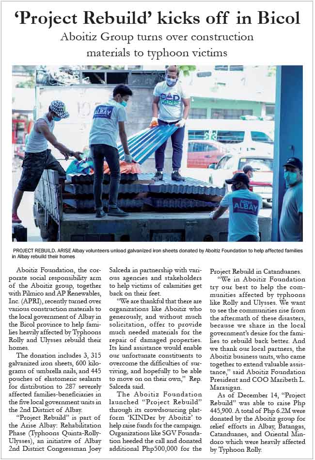 FacebookInstagramTwitterYoutube Thursday, October 23, 2025 SEARCH Subscribe Home Business Business News World Business Corporate News Market Makers Marketing Board Shipping & Transportation News National News International News Sports Baseball Basketball Billiard Boxing Football Golf Olympics Other Sports Sea Games Tennis Volleyball Lifestyle Arts Columns Fashion Food Health Home Living Entertainment Columns Movies Music/Concert/Shows Spotlight TV/Streaming Opinion Column of the day Editorial Cartoon Editorial Opinion of the day Weekly Features Banking & Finance Torque & Power Alternative Fuel/Electric Vehicles Commercial Vehicles Luxury Cars Motorcycles Test Drives Infotech & Electronics Appliances/Electronics Constructioneering Cybersecurity/Privacy e-Commerce e-Sports/Gaming Fintech/Crypto Gadgets Imaging Printed Circuit Science and Technology Socmed Tech Industry Tech This Week Tech People Property Travel & Tourism Special Features Anniversary Issues 42nd Anniversary Section C Section D Section E Section F Section G Section H 41st Anniversary Supplement 40th Anniversary Report 39th Anniversary Report 38th Anniversary Report Supplements Branded Content Notices ABOITIZ GROUP: Project Rebuild kicks off in Bicol By ___ December 30, 2020 11:29 PM Updated: December 30, 2020 11:29 PM Share FacebookTwitterPinterestWhatsApp Asia Event Group Inc. launches Aftermarket Expo Asia 2025: A premier platform for innovation and growth in the automotive sector October 2, 2025 Fight vs. illegal gambling gets boost with ₱50M PAGCOR grant to NBI October 2, 2025 NUSTAR Online joins as major sponsor of RED Charity Gala 2025, championing fashion, philanthropy, and Filipino ingenuity October 2, 2025 Nestlé Wellness Campus promotes the importance of nutritious breakfast and healthy habits during Better Breakfast Month October 2, 2025 PlayTime CARES: Strengthening communities and supporting Government for nation-building October 2, 2025 Share FacebookTwitterPinterestWhatsApp Previous articleBetter IT career opportunities, cash prizes while learning enterprise computingNext articleRedefining the high-end in the Internet of Experience - Advertisement - - Advertisement - E-Paper More Stories NUSTAR Online joins as major sponsor of RED Charity Gala 2025, championing fashion, philanthropy, and Filipino ingenuity Nestlé Wellness Campus promotes the importance of nutritious breakfast and healthy habits during Better Breakfast Month Load more Related Stories ___ - October 2, 2025Asia Event Group Inc. launches Aftermarket Expo Asia 2025: A premier platform for innovation and growth in the automotive sector ___ - October 2, 2025Fight vs. illegal gambling gets boost with ₱50M PAGCOR grant to NBI ___ - October 2, 2025NUSTAR Online joins as major sponsor of RED Charity Gala 2025, championing fashion, philanthropy, and Filipino ingenuity Load more