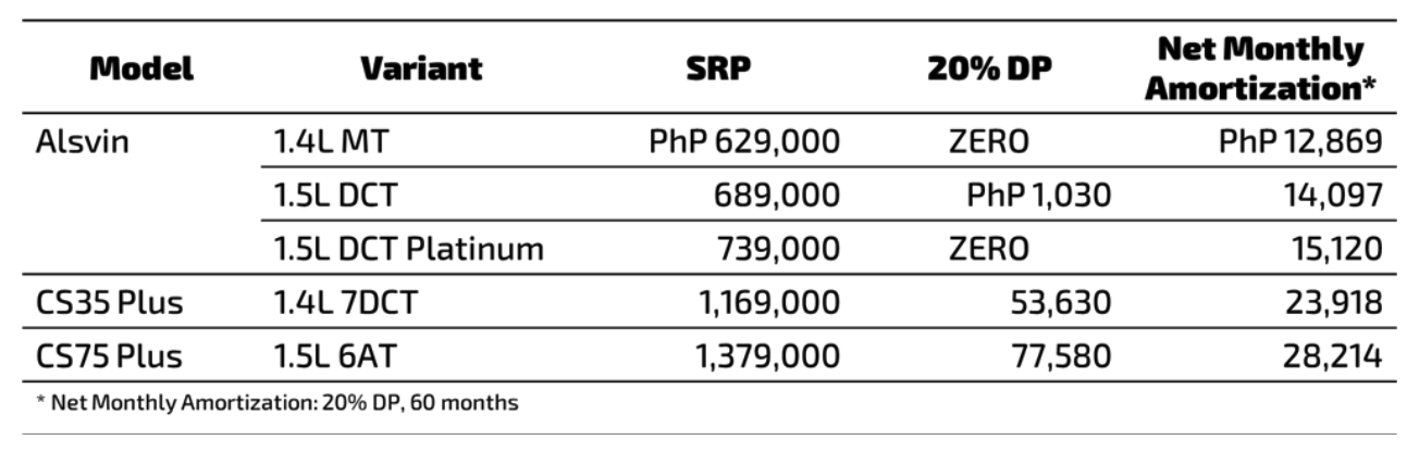 Also available are 20% down payment- and low monthly amortization schemes. All financing payment options come with an All-in Package that includes: one (1) year comprehensive motorcar insurance, three (3) year LTO registration, Chattel Mortgage, and standard freebies such as tint, floor mats, seat covers.