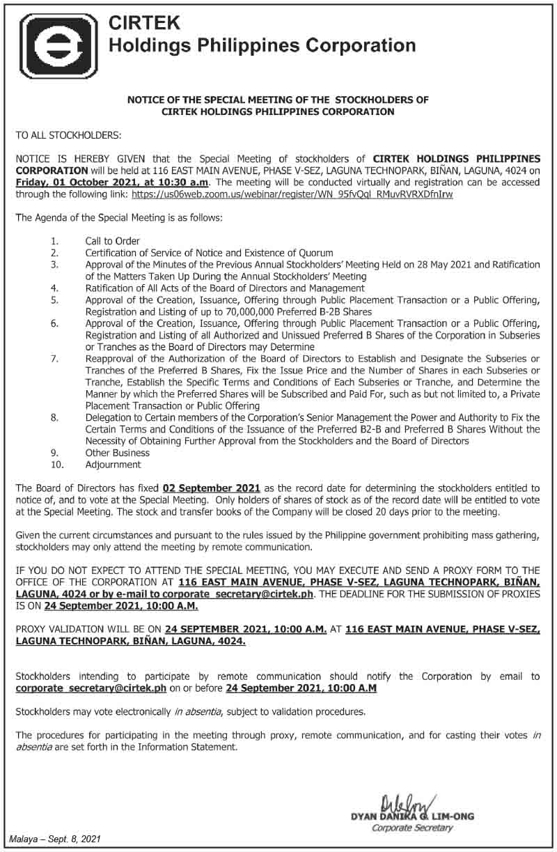 FacebookInstagramTwitterYoutube Saturday, November 1, 2025 SEARCH Subscribe Home Business Business News World Business Corporate News Market Makers Marketing Board Shipping & Transportation News National News International News Sports Baseball Basketball Billiard Boxing Football Golf Olympics Other Sports Sea Games Tennis Volleyball Lifestyle Arts Columns Fashion Food Health Home Living Entertainment Columns Movies Music/Concert/Shows Spotlight TV/Streaming Opinion Column of the day Editorial Cartoon Editorial Opinion of the day Weekly Features Banking & Finance Torque & Power Alternative Fuel/Electric Vehicles Commercial Vehicles Luxury Cars Motorcycles Test Drives Infotech & Electronics Appliances/Electronics Constructioneering Cybersecurity/Privacy e-Commerce e-Sports/Gaming Fintech/Crypto Gadgets Imaging Printed Circuit Science and Technology Socmed Tech Industry Tech This Week Tech People Property Travel & Tourism Special Features Anniversary Issues 42nd Anniversary Section C Section D Section E Section F Section G Section H 41st Anniversary Supplement 40th Anniversary Report 39th Anniversary Report 38th Anniversary Report Supplements Branded Content Notices CIRTEK HOLDINGS PHILS. CORP: Notice of Special Meeting of the Stockholders By ___ September 8, 2021 12:00 AM Updated: September 8, 2021 12:00 AM Share FacebookTwitterPinterestWhatsApp Asia Event Group Inc. launches Aftermarket Expo Asia 2025: A premier platform for innovation and growth in the automotive sector October 2, 2025 Fight vs. illegal gambling gets boost with ₱50M PAGCOR grant to NBI October 2, 2025 NUSTAR Online joins as major sponsor of RED Charity Gala 2025, championing fashion, philanthropy, and Filipino ingenuity October 2, 2025 Nestlé Wellness Campus promotes the importance of nutritious breakfast and healthy habits during Better Breakfast Month October 2, 2025 PlayTime CARES: Strengthening communities and supporting Government for nation-building October 2, 2025 Share FacebookTwitterPinterestWhatsApp Previous articleNissan unveils upgraded TerraNext article - Advertisement - - Advertisement - E-Paper More Stories NUSTAR Online joins as major sponsor of RED Charity Gala 2025, championing fashion, philanthropy, and Filipino ingenuity Nestlé Wellness Campus promotes the importance of nutritious breakfast and healthy habits during Better Breakfast Month Load more Related Stories ___ - October 2, 2025Asia Event Group Inc. launches Aftermarket Expo Asia 2025: A premier platform for innovation and growth in the automotive sector ___ - October 2, 2025Fight vs. illegal gambling gets boost with ₱50M PAGCOR grant to NBI ___ - October 2, 2025NUSTAR Online joins as major sponsor of RED Charity Gala 2025, championing fashion, philanthropy, and Filipino ingenuity Load more