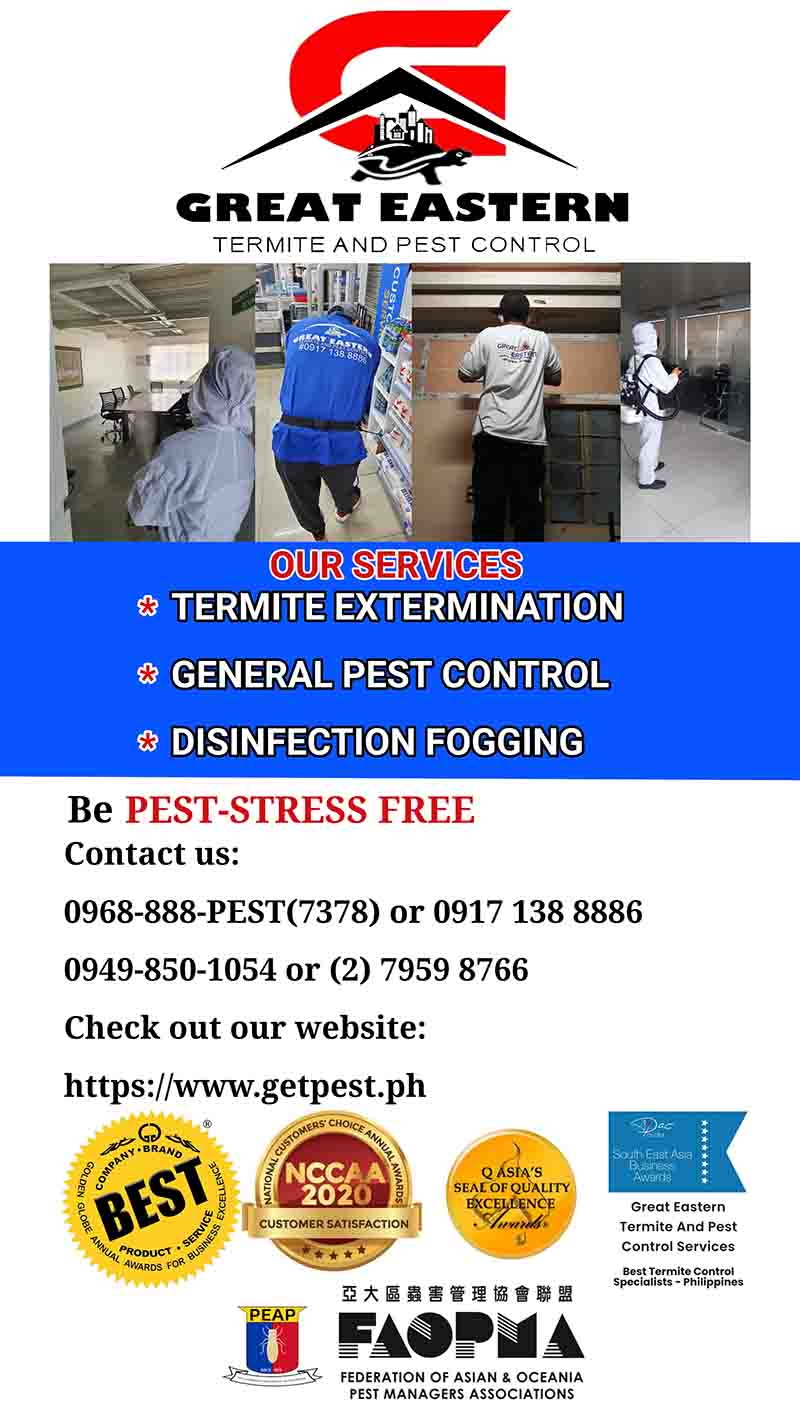 FacebookInstagramTwitterYoutube Tuesday, November 4, 2025 SEARCH Subscribe Home Business Business News World Business Corporate News Market Makers Marketing Board Shipping & Transportation News National News International News Sports Baseball Basketball Billiard Boxing Football Golf Olympics Other Sports Sea Games Tennis Volleyball Lifestyle Arts Columns Fashion Food Health Home Living Entertainment Columns Movies Music/Concert/Shows Spotlight TV/Streaming Opinion Column of the day Editorial Cartoon Editorial Opinion of the day Weekly Features Banking & Finance Torque & Power Alternative Fuel/Electric Vehicles Commercial Vehicles Luxury Cars Motorcycles Test Drives Infotech & Electronics Appliances/Electronics Constructioneering Cybersecurity/Privacy e-Commerce e-Sports/Gaming Fintech/Crypto Gadgets Imaging Printed Circuit Science and Technology Socmed Tech Industry Tech This Week Tech People Property Travel & Tourism Special Features Anniversary Issues 42nd Anniversary Section C Section D Section E Section F Section G Section H 41st Anniversary Supplement 40th Anniversary Report 39th Anniversary Report 38th Anniversary Report Supplements Branded Content Notices Great Eastern Termite and Pest Control By ___ November 17, 2021 12:00 AM Updated: November 17, 2021 12:00 AM Share FacebookTwitterPinterestWhatsApp Asia Event Group Inc. launches Aftermarket Expo Asia 2025: A premier platform for innovation and growth in the automotive sector October 2, 2025 Fight vs. illegal gambling gets boost with ₱50M PAGCOR grant to NBI October 2, 2025 NUSTAR Online joins as major sponsor of RED Charity Gala 2025, championing fashion, philanthropy, and Filipino ingenuity October 2, 2025 Nestlé Wellness Campus promotes the importance of nutritious breakfast and healthy habits during Better Breakfast Month October 2, 2025 PlayTime CARES: Strengthening communities and supporting Government for nation-building October 2, 2025 Share FacebookTwitterPinterestWhatsApp Previous articleTale as bold as prideNext articleMoral scruples not for the poor - Advertisement - - Advertisement - E-Paper More Stories NUSTAR Online joins as major sponsor of RED Charity Gala 2025, championing fashion, philanthropy, and Filipino ingenuity Nestlé Wellness Campus promotes the importance of nutritious breakfast and healthy habits during Better Breakfast Month Load more Related Stories ___ - October 2, 2025Asia Event Group Inc. launches Aftermarket Expo Asia 2025: A premier platform for innovation and growth in the automotive sector ___ - October 2, 2025Fight vs. illegal gambling gets boost with ₱50M PAGCOR grant to NBI ___ - October 2, 2025NUSTAR Online joins as major sponsor of RED Charity Gala 2025, championing fashion, philanthropy, and Filipino ingenuity Load more