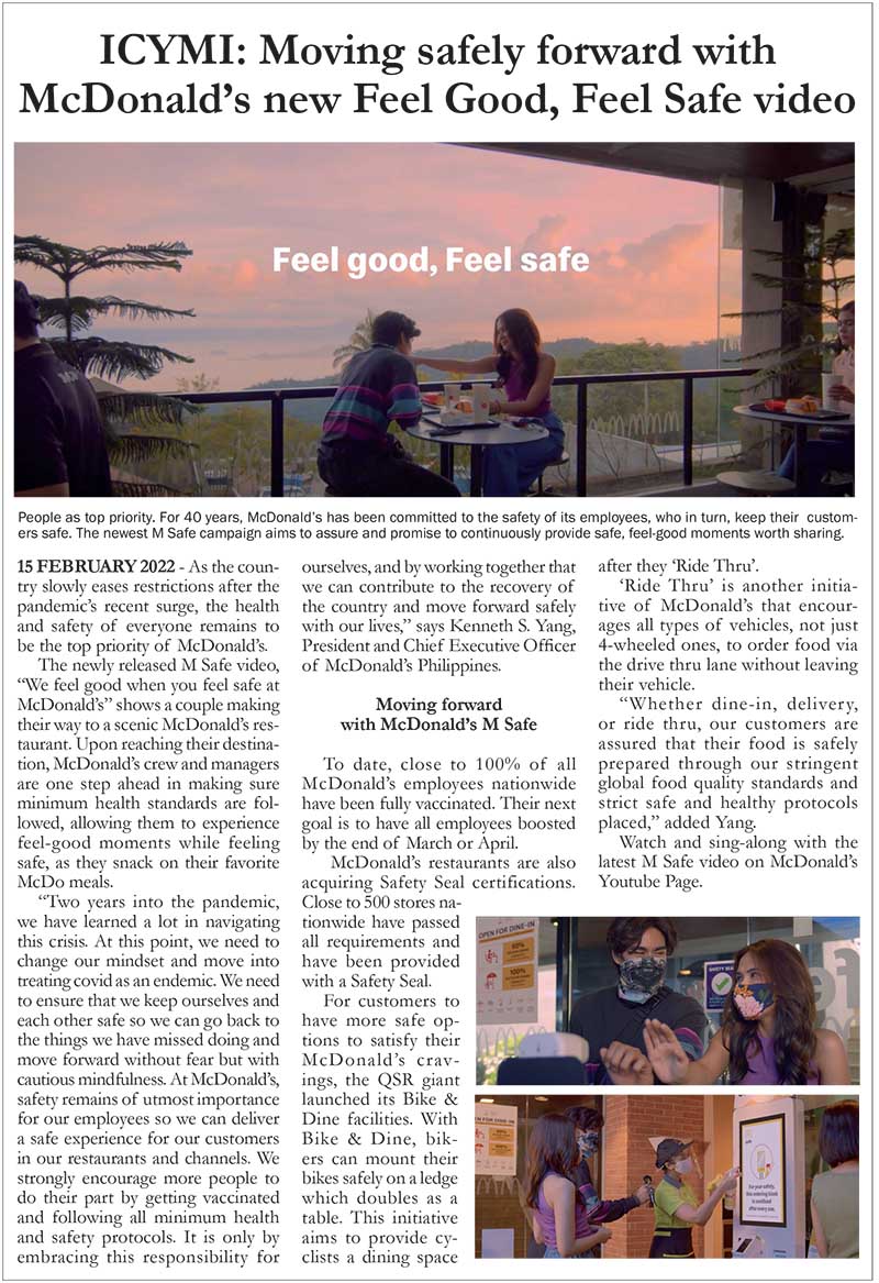 FacebookInstagramTwitterYoutube Saturday, October 25, 2025 SEARCH Subscribe Home Business Business News World Business Corporate News Market Makers Marketing Board Shipping & Transportation News National News International News Sports Baseball Basketball Billiard Boxing Football Golf Olympics Other Sports Sea Games Tennis Volleyball Lifestyle Arts Columns Fashion Food Health Home Living Entertainment Columns Movies Music/Concert/Shows Spotlight TV/Streaming Opinion Column of the day Editorial Cartoon Editorial Opinion of the day Weekly Features Banking & Finance Torque & Power Alternative Fuel/Electric Vehicles Commercial Vehicles Luxury Cars Motorcycles Test Drives Infotech & Electronics Appliances/Electronics Constructioneering Cybersecurity/Privacy e-Commerce e-Sports/Gaming Fintech/Crypto Gadgets Imaging Printed Circuit Science and Technology Socmed Tech Industry Tech This Week Tech People Property Travel & Tourism Special Features Anniversary Issues 42nd Anniversary Section C Section D Section E Section F Section G Section H 41st Anniversary Supplement 40th Anniversary Report 39th Anniversary Report 38th Anniversary Report Supplements Branded Content Notices ICYMI: McDonald’s Feel Good, Feel Safe By ___ February 15, 2022 10:00 AM Updated: February 15, 2022 10:00 AM Share FacebookTwitterPinterestWhatsApp Asia Event Group Inc. launches Aftermarket Expo Asia 2025: A premier platform for innovation and growth in the automotive sector October 2, 2025 Fight vs. illegal gambling gets boost with ₱50M PAGCOR grant to NBI October 2, 2025 NUSTAR Online joins as major sponsor of RED Charity Gala 2025, championing fashion, philanthropy, and Filipino ingenuity October 2, 2025 Nestlé Wellness Campus promotes the importance of nutritious breakfast and healthy habits during Better Breakfast Month October 2, 2025 PlayTime CARES: Strengthening communities and supporting Government for nation-building October 2, 2025 Share FacebookTwitterPinterestWhatsApp Previous articlePingris graces PSA ForumNext article - Advertisement - - Advertisement - E-Paper More Stories NUSTAR Online joins as major sponsor of RED Charity Gala 2025, championing fashion, philanthropy, and Filipino ingenuity Nestlé Wellness Campus promotes the importance of nutritious breakfast and healthy habits during Better Breakfast Month Load more Related Stories ___ - October 2, 2025Asia Event Group Inc. launches Aftermarket Expo Asia 2025: A premier platform for innovation and growth in the automotive sector ___ - October 2, 2025Fight vs. illegal gambling gets boost with ₱50M PAGCOR grant to NBI ___ - October 2, 2025NUSTAR Online joins as major sponsor of RED Charity Gala 2025, championing fashion, philanthropy, and Filipino ingenuity Load more