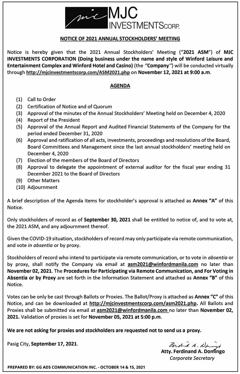 FacebookInstagramTwitterYoutube Thursday, October 23, 2025 SEARCH Subscribe Home Business Business News World Business Corporate News Market Makers Marketing Board Shipping & Transportation News National News International News Sports Baseball Basketball Billiard Boxing Football Golf Olympics Other Sports Sea Games Tennis Volleyball Lifestyle Arts Columns Fashion Food Health Home Living Entertainment Columns Movies Music/Concert/Shows Spotlight TV/Streaming Opinion Column of the day Editorial Cartoon Editorial Opinion of the day Weekly Features Banking & Finance Torque & Power Alternative Fuel/Electric Vehicles Commercial Vehicles Luxury Cars Motorcycles Test Drives Infotech & Electronics Appliances/Electronics Constructioneering Cybersecurity/Privacy e-Commerce e-Sports/Gaming Fintech/Crypto Gadgets Imaging Printed Circuit Science and Technology Socmed Tech Industry Tech This Week Tech People Property Travel & Tourism Special Features Anniversary Issues 42nd Anniversary Section C Section D Section E Section F Section G Section H 41st Anniversary Supplement 40th Anniversary Report 39th Anniversary Report 38th Anniversary Report Supplements Branded Content Notices MJC INVESTMENTS: Notice of 2021 Annual Stockholders’ Meeting By ___ October 14, 2021 12:00 AM Updated: October 14, 2021 12:00 AM Share FacebookTwitterPinterestWhatsApp Asia Event Group Inc. launches Aftermarket Expo Asia 2025: A premier platform for innovation and growth in the automotive sector October 2, 2025 Fight vs. illegal gambling gets boost with ₱50M PAGCOR grant to NBI October 2, 2025 NUSTAR Online joins as major sponsor of RED Charity Gala 2025, championing fashion, philanthropy, and Filipino ingenuity October 2, 2025 Nestlé Wellness Campus promotes the importance of nutritious breakfast and healthy habits during Better Breakfast Month October 2, 2025 PlayTime CARES: Strengthening communities and supporting Government for nation-building October 2, 2025 Share FacebookTwitterPinterestWhatsApp Previous articleIntelligent finance key to unlocking agile innovation for businessesNext articleMANILA JOCKEY CLUB: Notice of 2021 Annual Stockholders’ Meeting - Advertisement - - Advertisement - E-Paper More Stories NUSTAR Online joins as major sponsor of RED Charity Gala 2025, championing fashion, philanthropy, and Filipino ingenuity Nestlé Wellness Campus promotes the importance of nutritious breakfast and healthy habits during Better Breakfast Month Load more Related Stories ___ - October 2, 2025Asia Event Group Inc. launches Aftermarket Expo Asia 2025: A premier platform for innovation and growth in the automotive sector ___ - October 2, 2025Fight vs. illegal gambling gets boost with ₱50M PAGCOR grant to NBI ___ - October 2, 2025NUSTAR Online joins as major sponsor of RED Charity Gala 2025, championing fashion, philanthropy, and Filipino ingenuity Load more