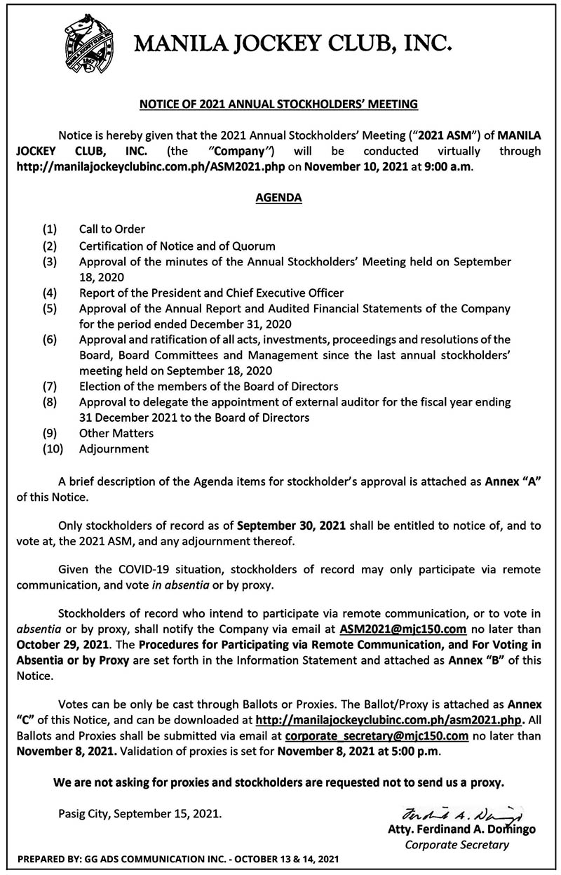 FacebookInstagramTwitterYoutube Thursday, October 23, 2025 SEARCH Subscribe Home Business Business News World Business Corporate News Market Makers Marketing Board Shipping & Transportation News National News International News Sports Baseball Basketball Billiard Boxing Football Golf Olympics Other Sports Sea Games Tennis Volleyball Lifestyle Arts Columns Fashion Food Health Home Living Entertainment Columns Movies Music/Concert/Shows Spotlight TV/Streaming Opinion Column of the day Editorial Cartoon Editorial Opinion of the day Weekly Features Banking & Finance Torque & Power Alternative Fuel/Electric Vehicles Commercial Vehicles Luxury Cars Motorcycles Test Drives Infotech & Electronics Appliances/Electronics Constructioneering Cybersecurity/Privacy e-Commerce e-Sports/Gaming Fintech/Crypto Gadgets Imaging Printed Circuit Science and Technology Socmed Tech Industry Tech This Week Tech People Property Travel & Tourism Special Features Anniversary Issues 42nd Anniversary Section C Section D Section E Section F Section G Section H 41st Anniversary Supplement 40th Anniversary Report 39th Anniversary Report 38th Anniversary Report Supplements Branded Content Notices MANILA JOCKEY CLUB: Notice of 2021 Annual Stockholders’ Meeting By ___ October 14, 2021 12:00 AM Updated: October 14, 2021 12:00 AM Share FacebookTwitterPinterestWhatsApp Asia Event Group Inc. launches Aftermarket Expo Asia 2025: A premier platform for innovation and growth in the automotive sector October 2, 2025 Fight vs. illegal gambling gets boost with ₱50M PAGCOR grant to NBI October 2, 2025 NUSTAR Online joins as major sponsor of RED Charity Gala 2025, championing fashion, philanthropy, and Filipino ingenuity October 2, 2025 Nestlé Wellness Campus promotes the importance of nutritious breakfast and healthy habits during Better Breakfast Month October 2, 2025 PlayTime CARES: Strengthening communities and supporting Government for nation-building October 2, 2025 Share FacebookTwitterPinterestWhatsApp Previous articleMJC INVESTMENTS: Notice of 2021 Annual Stockholders’ MeetingNext articleCHERRY PREPAID concept store, MAP Management Man of the Year, BDO commended by ABF, CEB vaccines delivery, New home service market, DHL Express for MSMEs, EWS supports farmers, HONDA’s upgraded filter, SHOPEE training program, J & J outreach - Advertisement - - Advertisement - E-Paper More Stories NUSTAR Online joins as major sponsor of RED Charity Gala 2025, championing fashion, philanthropy, and Filipino ingenuity Nestlé Wellness Campus promotes the importance of nutritious breakfast and healthy habits during Better Breakfast Month Load more Related Stories ___ - October 2, 2025Asia Event Group Inc. launches Aftermarket Expo Asia 2025: A premier platform for innovation and growth in the automotive sector ___ - October 2, 2025Fight vs. illegal gambling gets boost with ₱50M PAGCOR grant to NBI ___ - October 2, 2025NUSTAR Online joins as major sponsor of RED Charity Gala 2025, championing fashion, philanthropy, and Filipino ingenuity Load more