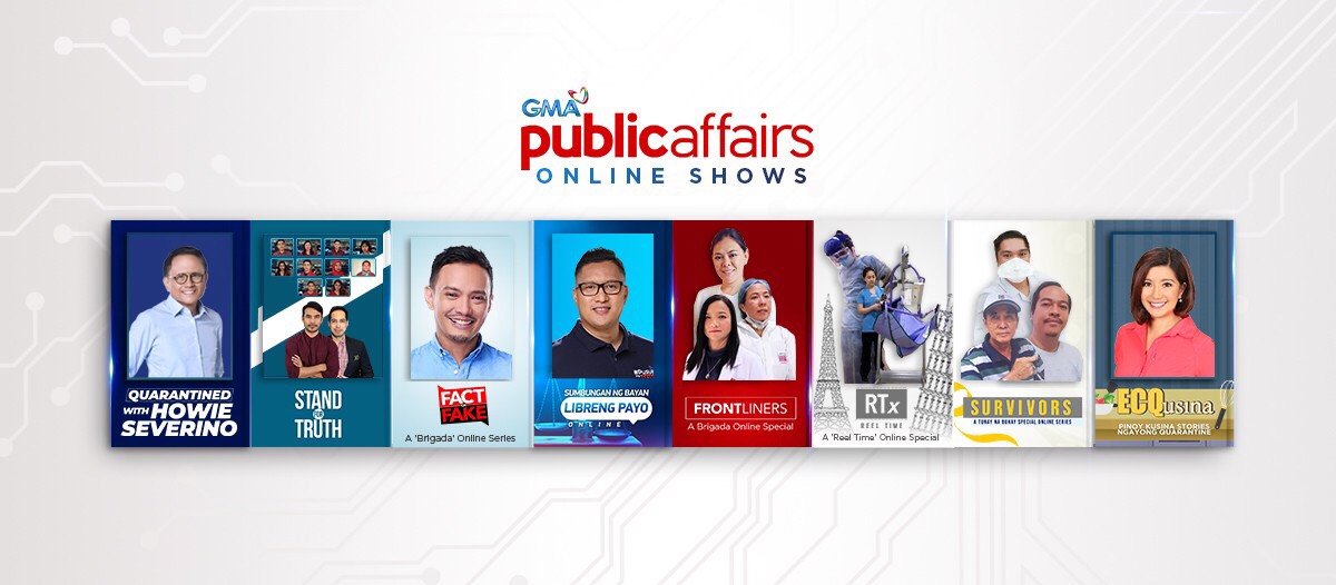 Available on various online platforms, these online shows include “Quarantined with Howie Severino,” “Stand for Truth,” “Fact or Fake with Joseph Morong,” “Sumbungan ng Bayan Libreng Payo Online,” “Frontliners: A Brigada Special Online Series,” “RTx,” “Survivors,” and “ECQusina: Pinoy Kusina Stories Ngayong Quarantine.” Some of these original shows feature stories that highlight Filipinos’ strength and ingenuity, as well as offer public service that is a trademark of GMA News and Public Affairs.