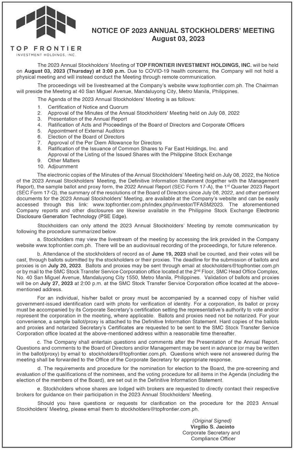 FacebookInstagramTwitterYoutube Friday, October 24, 2025 SEARCH Subscribe Home Business Business News World Business Corporate News Market Makers Marketing Board Shipping & Transportation News National News International News Sports Baseball Basketball Billiard Boxing Football Golf Olympics Other Sports Sea Games Tennis Volleyball Lifestyle Arts Columns Fashion Food Health Home Living Entertainment Columns Movies Music/Concert/Shows Spotlight TV/Streaming Opinion Column of the day Editorial Cartoon Editorial Opinion of the day Weekly Features Banking & Finance Torque & Power Alternative Fuel/Electric Vehicles Commercial Vehicles Luxury Cars Motorcycles Test Drives Infotech & Electronics Appliances/Electronics Constructioneering Cybersecurity/Privacy e-Commerce e-Sports/Gaming Fintech/Crypto Gadgets Imaging Printed Circuit Science and Technology Socmed Tech Industry Tech This Week Tech People Property Travel & Tourism Special Features Anniversary Issues 42nd Anniversary Section C Section D Section E Section F Section G Section H 41st Anniversary Supplement 40th Anniversary Report 39th Anniversary Report 38th Anniversary Report Supplements Branded Content Notices NOTICE OF 2023 ANNUAL STOCKHOLDERS’ MEETING: Top Frontier Investment Holdings, Inc. By ___ June 27, 2023 8:59 AM Updated: June 27, 2023 8:59 AM Share FacebookTwitterPinterestWhatsApp Asia Event Group Inc. launches Aftermarket Expo Asia 2025: A premier platform for innovation and growth in the automotive sector October 2, 2025 Fight vs. illegal gambling gets boost with ₱50M PAGCOR grant to NBI October 2, 2025 NUSTAR Online joins as major sponsor of RED Charity Gala 2025, championing fashion, philanthropy, and Filipino ingenuity October 2, 2025 Nestlé Wellness Campus promotes the importance of nutritious breakfast and healthy habits during Better Breakfast Month October 2, 2025 PlayTime CARES: Strengthening communities and supporting Government for nation-building October 2, 2025 Share FacebookTwitterPinterestWhatsApp Previous articleWinning moments at 9th ‘Marry Me At Marriott’Next articleNOTICE OF ANNUAL MEETING OF STOCKHOLDERS: Axelum Resources Corp. - Advertisement - - Advertisement - E-Paper More Stories NUSTAR Online joins as major sponsor of RED Charity Gala 2025, championing fashion, philanthropy, and Filipino ingenuity Nestlé Wellness Campus promotes the importance of nutritious breakfast and healthy habits during Better Breakfast Month Load more Related Stories ___ - October 2, 2025Asia Event Group Inc. launches Aftermarket Expo Asia 2025: A premier platform for innovation and growth in the automotive sector ___ - October 2, 2025Fight vs. illegal gambling gets boost with ₱50M PAGCOR grant to NBI ___ - October 2, 2025NUSTAR Online joins as major sponsor of RED Charity Gala 2025, championing fashion, philanthropy, and Filipino ingenuity Load more