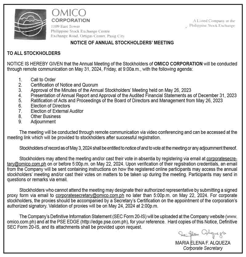 FacebookInstagramTwitterYoutube Friday, October 24, 2025 SEARCH Subscribe Home Business Business News World Business Corporate News Market Makers Marketing Board Shipping & Transportation News National News International News Sports Baseball Basketball Billiard Boxing Football Golf Olympics Other Sports Sea Games Tennis Volleyball Lifestyle Arts Columns Fashion Food Health Home Living Entertainment Columns Movies Music/Concert/Shows Spotlight TV/Streaming Opinion Column of the day Editorial Cartoon Editorial Opinion of the day Weekly Features Banking & Finance Torque & Power Alternative Fuel/Electric Vehicles Commercial Vehicles Luxury Cars Motorcycles Test Drives Infotech & Electronics Appliances/Electronics Constructioneering Cybersecurity/Privacy e-Commerce e-Sports/Gaming Fintech/Crypto Gadgets Imaging Printed Circuit Science and Technology Socmed Tech Industry Tech This Week Tech People Property Travel & Tourism Special Features Anniversary Issues 42nd Anniversary Section C Section D Section E Section F Section G Section H 41st Anniversary Supplement 40th Anniversary Report 39th Anniversary Report 38th Anniversary Report Supplements Branded Content Notices NOTICE OF ANNUAL STOCKHOLDERS’ MEETING: Omico Corporation By ___ May 7, 2024 12:00 AM Updated: May 7, 2024 12:00 AM Share FacebookTwitterPinterestWhatsApp Asia Event Group Inc. launches Aftermarket Expo Asia 2025: A premier platform for innovation and growth in the automotive sector October 2, 2025 Fight vs. illegal gambling gets boost with ₱50M PAGCOR grant to NBI October 2, 2025 NUSTAR Online joins as major sponsor of RED Charity Gala 2025, championing fashion, philanthropy, and Filipino ingenuity October 2, 2025 Nestlé Wellness Campus promotes the importance of nutritious breakfast and healthy habits during Better Breakfast Month October 2, 2025 PlayTime CARES: Strengthening communities and supporting Government for nation-building October 2, 2025 Share FacebookTwitterPinterestWhatsApp Previous articleJean Henri Lhuillier conferred UMAK’s highest honorary degreeNext articleNews Highlights: May 7, 2024 - Advertisement - - Advertisement - E-Paper More Stories NUSTAR Online joins as major sponsor of RED Charity Gala 2025, championing fashion, philanthropy, and Filipino ingenuity Nestlé Wellness Campus promotes the importance of nutritious breakfast and healthy habits during Better Breakfast Month Load more Related Stories ___ - October 2, 2025Asia Event Group Inc. launches Aftermarket Expo Asia 2025: A premier platform for innovation and growth in the automotive sector ___ - October 2, 2025Fight vs. illegal gambling gets boost with ₱50M PAGCOR grant to NBI ___ - October 2, 2025NUSTAR Online joins as major sponsor of RED Charity Gala 2025, championing fashion, philanthropy, and Filipino ingenuity Load more