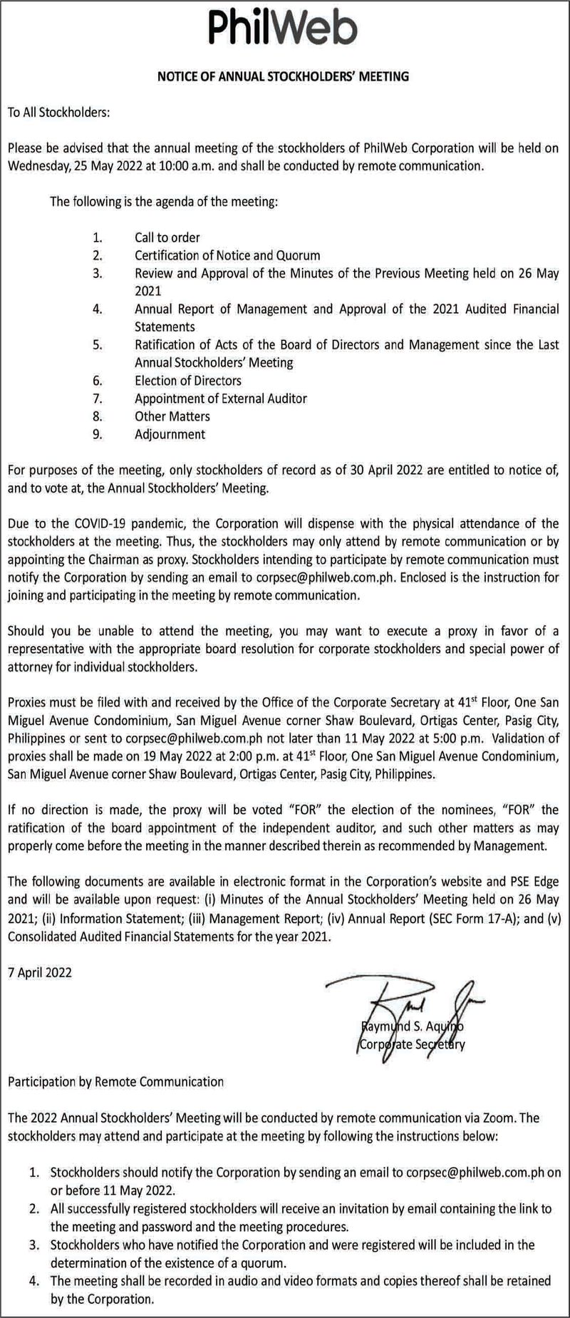 FacebookInstagramTwitterYoutube Wednesday, October 29, 2025 SEARCH Subscribe Home Business Business News World Business Corporate News Market Makers Marketing Board Shipping & Transportation News National News International News Sports Baseball Basketball Billiard Boxing Football Golf Olympics Other Sports Sea Games Tennis Volleyball Lifestyle Arts Columns Fashion Food Health Home Living Entertainment Columns Movies Music/Concert/Shows Spotlight TV/Streaming Opinion Column of the day Editorial Cartoon Editorial Opinion of the day Weekly Features Banking & Finance Torque & Power Alternative Fuel/Electric Vehicles Commercial Vehicles Luxury Cars Motorcycles Test Drives Infotech & Electronics Appliances/Electronics Constructioneering Cybersecurity/Privacy e-Commerce e-Sports/Gaming Fintech/Crypto Gadgets Imaging Printed Circuit Science and Technology Socmed Tech Industry Tech This Week Tech People Property Travel & Tourism Special Features Anniversary Issues 42nd Anniversary Section C Section D Section E Section F Section G Section H 41st Anniversary Supplement 40th Anniversary Report 39th Anniversary Report 38th Anniversary Report Supplements Branded Content Notices NOTICE OF ANNUAL STOCKHOLDERS’ MEETING: PhilWeb By ___ May 3, 2022 12:03 AM Updated: May 3, 2022 12:03 AM Share FacebookTwitterPinterestWhatsApp Asia Event Group Inc. launches Aftermarket Expo Asia 2025: A premier platform for innovation and growth in the automotive sector October 2, 2025 Fight vs. illegal gambling gets boost with ₱50M PAGCOR grant to NBI October 2, 2025 NUSTAR Online joins as major sponsor of RED Charity Gala 2025, championing fashion, philanthropy, and Filipino ingenuity October 2, 2025 Nestlé Wellness Campus promotes the importance of nutritious breakfast and healthy habits during Better Breakfast Month October 2, 2025 PlayTime CARES: Strengthening communities and supporting Government for nation-building October 2, 2025 Share FacebookTwitterPinterestWhatsApp Previous articleNOTICE OF ANNUAL STOCKHOLDERS’ MEETING: Omico CorporationNext articleMeralco prepares distribution facilities ahead of 2022 national, local elections - Advertisement - - Advertisement - E-Paper More Stories NUSTAR Online joins as major sponsor of RED Charity Gala 2025, championing fashion, philanthropy, and Filipino ingenuity Nestlé Wellness Campus promotes the importance of nutritious breakfast and healthy habits during Better Breakfast Month Load more Related Stories ___ - October 2, 2025Asia Event Group Inc. launches Aftermarket Expo Asia 2025: A premier platform for innovation and growth in the automotive sector ___ - October 2, 2025Fight vs. illegal gambling gets boost with ₱50M PAGCOR grant to NBI ___ - October 2, 2025NUSTAR Online joins as major sponsor of RED Charity Gala 2025, championing fashion, philanthropy, and Filipino ingenuity Load more