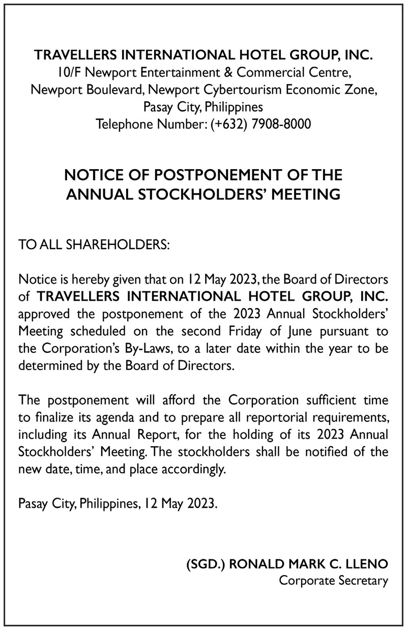 FacebookInstagramTwitterYoutube Wednesday, October 29, 2025 SEARCH Subscribe Home Business Business News World Business Corporate News Market Makers Marketing Board Shipping & Transportation News National News International News Sports Baseball Basketball Billiard Boxing Football Golf Olympics Other Sports Sea Games Tennis Volleyball Lifestyle Arts Columns Fashion Food Health Home Living Entertainment Columns Movies Music/Concert/Shows Spotlight TV/Streaming Opinion Column of the day Editorial Cartoon Editorial Opinion of the day Weekly Features Banking & Finance Torque & Power Alternative Fuel/Electric Vehicles Commercial Vehicles Luxury Cars Motorcycles Test Drives Infotech & Electronics Appliances/Electronics Constructioneering Cybersecurity/Privacy e-Commerce e-Sports/Gaming Fintech/Crypto Gadgets Imaging Printed Circuit Science and Technology Socmed Tech Industry Tech This Week Tech People Property Travel & Tourism Special Features Anniversary Issues 42nd Anniversary Section C Section D Section E Section F Section G Section H 41st Anniversary Supplement 40th Anniversary Report 39th Anniversary Report 38th Anniversary Report Supplements Branded Content Notices NOTICE OF POSTPONEMENT OF ANNUAL STOCKHOLDERS’ MEETING: Travellers International Hotel Group, Inc. By ___ May 18, 2023 8:56 AM Updated: May 18, 2023 8:56 AM Share FacebookTwitterPinterestWhatsApp Asia Event Group Inc. launches Aftermarket Expo Asia 2025: A premier platform for innovation and growth in the automotive sector October 2, 2025 Fight vs. illegal gambling gets boost with ₱50M PAGCOR grant to NBI October 2, 2025 NUSTAR Online joins as major sponsor of RED Charity Gala 2025, championing fashion, philanthropy, and Filipino ingenuity October 2, 2025 Nestlé Wellness Campus promotes the importance of nutritious breakfast and healthy habits during Better Breakfast Month October 2, 2025 PlayTime CARES: Strengthening communities and supporting Government for nation-building October 2, 2025 Share FacebookTwitterPinterestWhatsApp Previous articleBallet Manila performs ‘Don Quixote’Next articleANNUAL STOCKHOLDERS’ MEETING: SPC Power Corporation - Advertisement - - Advertisement - E-Paper More Stories NUSTAR Online joins as major sponsor of RED Charity Gala 2025, championing fashion, philanthropy, and Filipino ingenuity Nestlé Wellness Campus promotes the importance of nutritious breakfast and healthy habits during Better Breakfast Month Load more Related Stories ___ - October 2, 2025Asia Event Group Inc. launches Aftermarket Expo Asia 2025: A premier platform for innovation and growth in the automotive sector ___ - October 2, 2025Fight vs. illegal gambling gets boost with ₱50M PAGCOR grant to NBI ___ - October 2, 2025NUSTAR Online joins as major sponsor of RED Charity Gala 2025, championing fashion, philanthropy, and Filipino ingenuity Load more