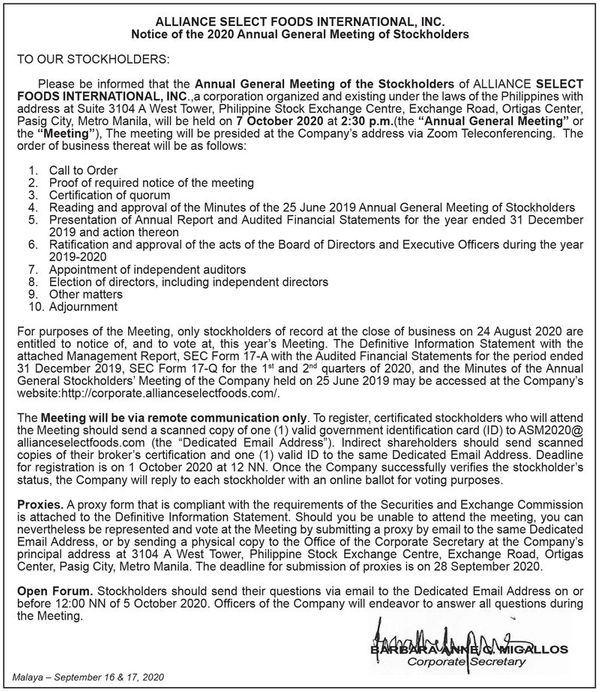 FacebookInstagramTwitterYoutube Friday, October 24, 2025 SEARCH Subscribe Home Business Business News World Business Corporate News Market Makers Marketing Board Shipping & Transportation News National News International News Sports Baseball Basketball Billiard Boxing Football Golf Olympics Other Sports Sea Games Tennis Volleyball Lifestyle Arts Columns Fashion Food Health Home Living Entertainment Columns Movies Music/Concert/Shows Spotlight TV/Streaming Opinion Column of the day Editorial Cartoon Editorial Opinion of the day Weekly Features Banking & Finance Torque & Power Alternative Fuel/Electric Vehicles Commercial Vehicles Luxury Cars Motorcycles Test Drives Infotech & Electronics Appliances/Electronics Constructioneering Cybersecurity/Privacy e-Commerce e-Sports/Gaming Fintech/Crypto Gadgets Imaging Printed Circuit Science and Technology Socmed Tech Industry Tech This Week Tech People Property Travel & Tourism Special Features Anniversary Issues 42nd Anniversary Section C Section D Section E Section F Section G Section H 41st Anniversary Supplement 40th Anniversary Report 39th Anniversary Report 38th Anniversary Report Supplements Branded Content Notices Notice of the 2020 Annual General Meeting of Stockholders: ALLIANCE SELECT FOODS INTERNATIONAL By ___ September 16, 2020 1:28 AM Updated: September 16, 2020 1:28 AM Share FacebookTwitterPinterestWhatsApp Asia Event Group Inc. launches Aftermarket Expo Asia 2025: A premier platform for innovation and growth in the automotive sector October 2, 2025 Fight vs. illegal gambling gets boost with ₱50M PAGCOR grant to NBI October 2, 2025 NUSTAR Online joins as major sponsor of RED Charity Gala 2025, championing fashion, philanthropy, and Filipino ingenuity October 2, 2025 Nestlé Wellness Campus promotes the importance of nutritious breakfast and healthy habits during Better Breakfast Month October 2, 2025 PlayTime CARES: Strengthening communities and supporting Government for nation-building October 2, 2025 Share FacebookTwitterPinterestWhatsApp Previous article“Take Action” from home with NASANext articleOppo Reno 4 customer care program - Advertisement - - Advertisement - E-Paper More Stories NUSTAR Online joins as major sponsor of RED Charity Gala 2025, championing fashion, philanthropy, and Filipino ingenuity Nestlé Wellness Campus promotes the importance of nutritious breakfast and healthy habits during Better Breakfast Month Load more Related Stories ___ - October 2, 2025Asia Event Group Inc. launches Aftermarket Expo Asia 2025: A premier platform for innovation and growth in the automotive sector ___ - October 2, 2025Fight vs. illegal gambling gets boost with ₱50M PAGCOR grant to NBI ___ - October 2, 2025NUSTAR Online joins as major sponsor of RED Charity Gala 2025, championing fashion, philanthropy, and Filipino ingenuity Load more