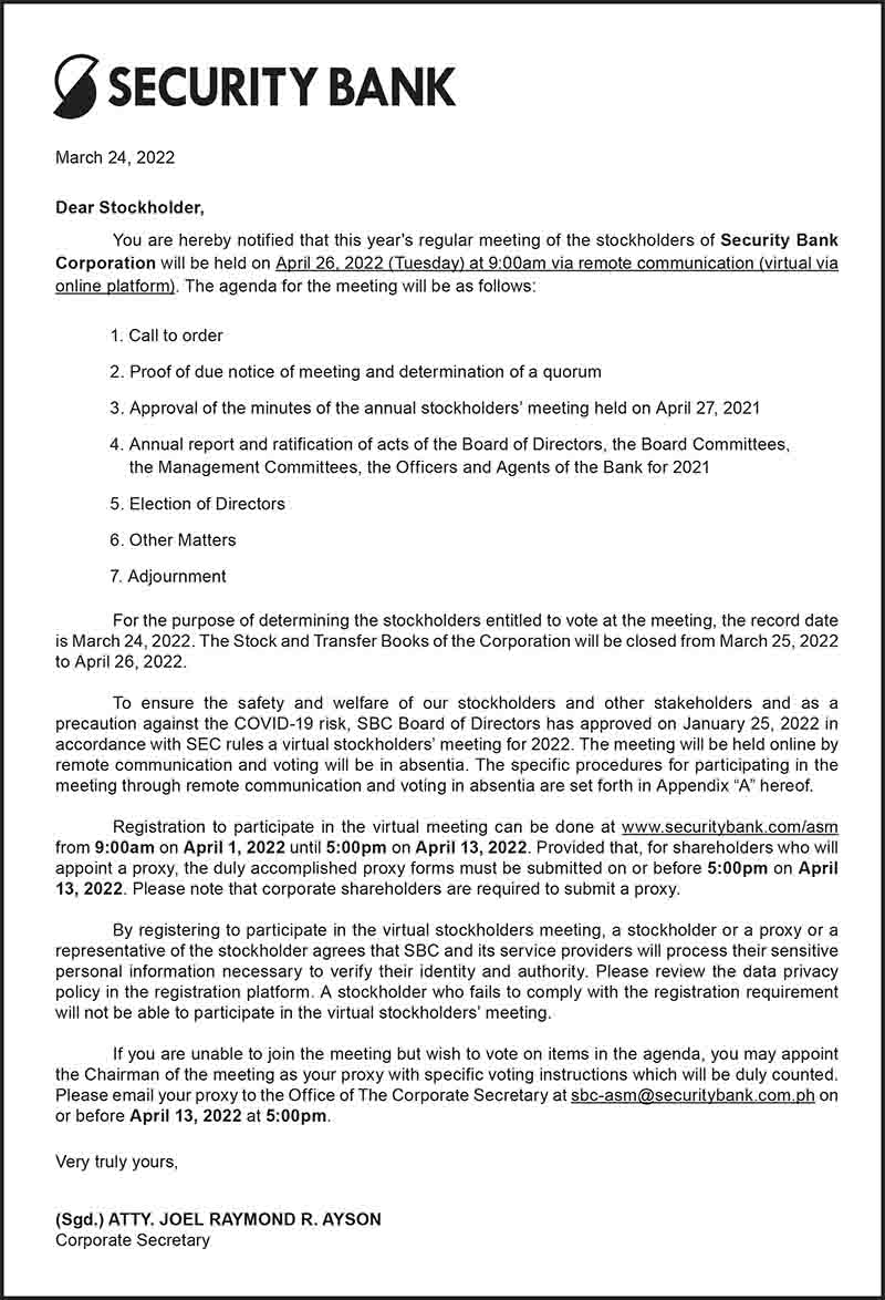 FacebookInstagramTwitterYoutube Wednesday, October 29, 2025 SEARCH Subscribe Home Business Business News World Business Corporate News Market Makers Marketing Board Shipping & Transportation News National News International News Sports Baseball Basketball Billiard Boxing Football Golf Olympics Other Sports Sea Games Tennis Volleyball Lifestyle Arts Columns Fashion Food Health Home Living Entertainment Columns Movies Music/Concert/Shows Spotlight TV/Streaming Opinion Column of the day Editorial Cartoon Editorial Opinion of the day Weekly Features Banking & Finance Torque & Power Alternative Fuel/Electric Vehicles Commercial Vehicles Luxury Cars Motorcycles Test Drives Infotech & Electronics Appliances/Electronics Constructioneering Cybersecurity/Privacy e-Commerce e-Sports/Gaming Fintech/Crypto Gadgets Imaging Printed Circuit Science and Technology Socmed Tech Industry Tech This Week Tech People Property Travel & Tourism Special Features Anniversary Issues 42nd Anniversary Section C Section D Section E Section F Section G Section H 41st Anniversary Supplement 40th Anniversary Report 39th Anniversary Report 38th Anniversary Report Supplements Branded Content Notices SECURITY BANK: Regular Meeting of Stockholders By ___ April 6, 2022 12:00 AM Updated: April 6, 2022 12:00 AM Share FacebookTwitterPinterestWhatsApp Asia Event Group Inc. launches Aftermarket Expo Asia 2025: A premier platform for innovation and growth in the automotive sector October 2, 2025 Fight vs. illegal gambling gets boost with ₱50M PAGCOR grant to NBI October 2, 2025 NUSTAR Online joins as major sponsor of RED Charity Gala 2025, championing fashion, philanthropy, and Filipino ingenuity October 2, 2025 Nestlé Wellness Campus promotes the importance of nutritious breakfast and healthy habits during Better Breakfast Month October 2, 2025 PlayTime CARES: Strengthening communities and supporting Government for nation-building October 2, 2025 Share FacebookTwitterPinterestWhatsApp Previous articleContinuing the legacy of financial advisingNext articleFIRST METRO INVESTMENT CORPORATION: Notice of Annual Meeting of the Stockholders - Advertisement - - Advertisement - E-Paper More Stories NUSTAR Online joins as major sponsor of RED Charity Gala 2025, championing fashion, philanthropy, and Filipino ingenuity Nestlé Wellness Campus promotes the importance of nutritious breakfast and healthy habits during Better Breakfast Month Load more Related Stories ___ - October 2, 2025Asia Event Group Inc. launches Aftermarket Expo Asia 2025: A premier platform for innovation and growth in the automotive sector ___ - October 2, 2025Fight vs. illegal gambling gets boost with ₱50M PAGCOR grant to NBI ___ - October 2, 2025NUSTAR Online joins as major sponsor of RED Charity Gala 2025, championing fashion, philanthropy, and Filipino ingenuity Load more