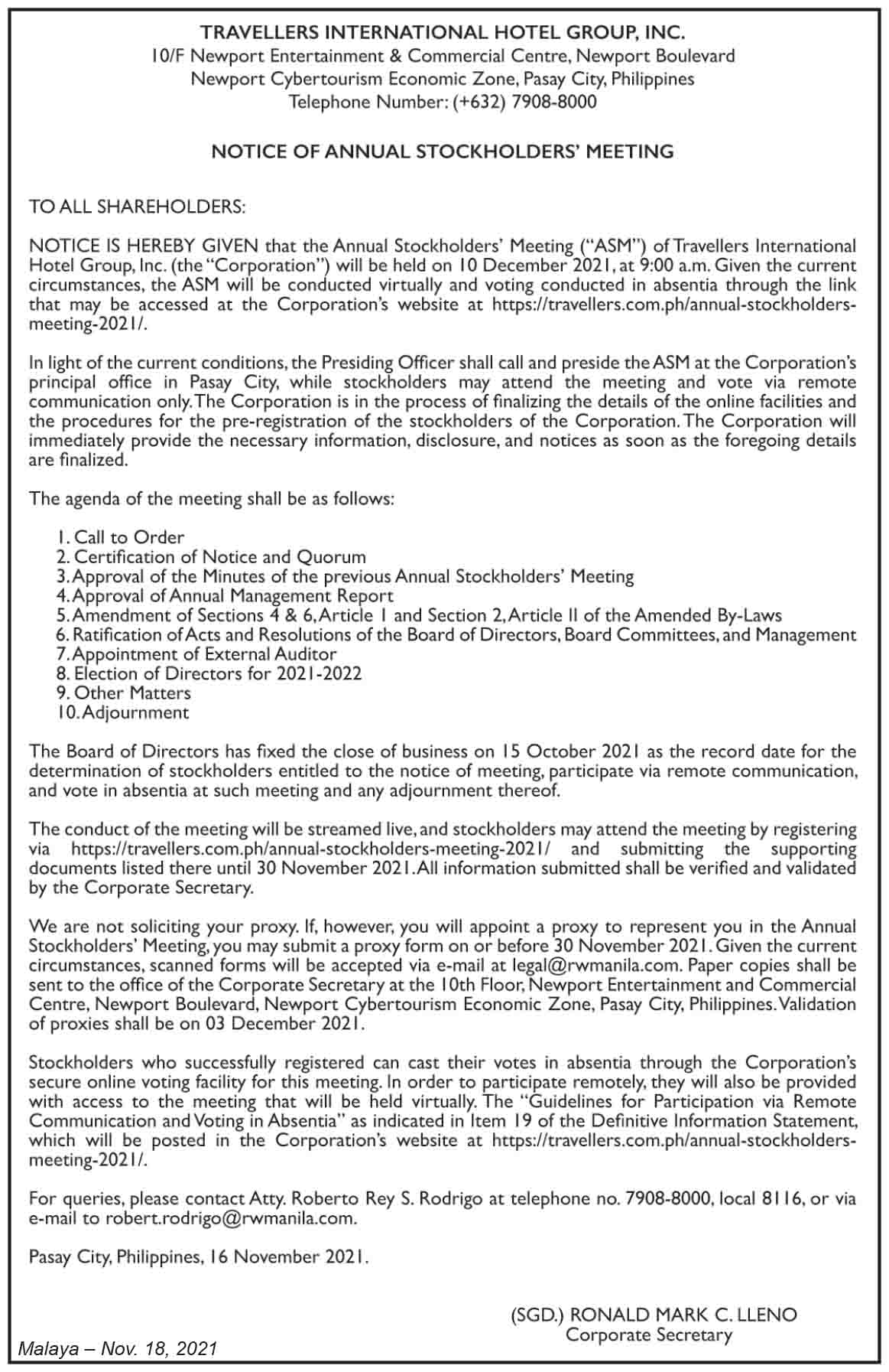 FacebookInstagramTwitterYoutube Monday, November 3, 2025 SEARCH Subscribe Home Business Business News World Business Corporate News Market Makers Marketing Board Shipping & Transportation News National News International News Sports Baseball Basketball Billiard Boxing Football Golf Olympics Other Sports Sea Games Tennis Volleyball Lifestyle Arts Columns Fashion Food Health Home Living Entertainment Columns Movies Music/Concert/Shows Spotlight TV/Streaming Opinion Column of the day Editorial Cartoon Editorial Opinion of the day Weekly Features Banking & Finance Torque & Power Alternative Fuel/Electric Vehicles Commercial Vehicles Luxury Cars Motorcycles Test Drives Infotech & Electronics Appliances/Electronics Constructioneering Cybersecurity/Privacy e-Commerce e-Sports/Gaming Fintech/Crypto Gadgets Imaging Printed Circuit Science and Technology Socmed Tech Industry Tech This Week Tech People Property Travel & Tourism Special Features Anniversary Issues 42nd Anniversary Section C Section D Section E Section F Section G Section H 41st Anniversary Supplement 40th Anniversary Report 39th Anniversary Report 38th Anniversary Report Supplements Branded Content Notices TRAVELLERS INTERNATIONAL HOTEL GROUP, INC: Notice of Annual Stockholders’ Meeting By ___ November 18, 2021 12:00 AM Updated: November 18, 2021 12:00 AM Share FacebookTwitterPinterestWhatsApp Asia Event Group Inc. launches Aftermarket Expo Asia 2025: A premier platform for innovation and growth in the automotive sector October 2, 2025 Fight vs. illegal gambling gets boost with ₱50M PAGCOR grant to NBI October 2, 2025 NUSTAR Online joins as major sponsor of RED Charity Gala 2025, championing fashion, philanthropy, and Filipino ingenuity October 2, 2025 Nestlé Wellness Campus promotes the importance of nutritious breakfast and healthy habits during Better Breakfast Month October 2, 2025 PlayTime CARES: Strengthening communities and supporting Government for nation-building October 2, 2025 Share FacebookTwitterPinterestWhatsApp Previous articleFord’s newest Ranger ready to deliver fun, versatility, connectivityNext articleNature-based solutions, digital platforms to achieve net zero - Advertisement - - Advertisement - E-Paper More Stories NUSTAR Online joins as major sponsor of RED Charity Gala 2025, championing fashion, philanthropy, and Filipino ingenuity Nestlé Wellness Campus promotes the importance of nutritious breakfast and healthy habits during Better Breakfast Month Load more Related Stories ___ - October 2, 2025Asia Event Group Inc. launches Aftermarket Expo Asia 2025: A premier platform for innovation and growth in the automotive sector ___ - October 2, 2025Fight vs. illegal gambling gets boost with ₱50M PAGCOR grant to NBI ___ - October 2, 2025NUSTAR Online joins as major sponsor of RED Charity Gala 2025, championing fashion, philanthropy, and Filipino ingenuity Load more