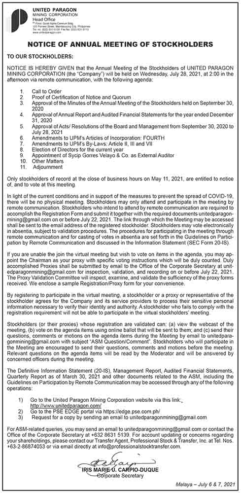 FacebookInstagramTwitterYoutube Friday, October 24, 2025 SEARCH Subscribe Home Business Business News World Business Corporate News Market Makers Marketing Board Shipping & Transportation News National News International News Sports Baseball Basketball Billiard Boxing Football Golf Olympics Other Sports Sea Games Tennis Volleyball Lifestyle Arts Columns Fashion Food Health Home Living Entertainment Columns Movies Music/Concert/Shows Spotlight TV/Streaming Opinion Column of the day Editorial Cartoon Editorial Opinion of the day Weekly Features Banking & Finance Torque & Power Alternative Fuel/Electric Vehicles Commercial Vehicles Luxury Cars Motorcycles Test Drives Infotech & Electronics Appliances/Electronics Constructioneering Cybersecurity/Privacy e-Commerce e-Sports/Gaming Fintech/Crypto Gadgets Imaging Printed Circuit Science and Technology Socmed Tech Industry Tech This Week Tech People Property Travel & Tourism Special Features Anniversary Issues 42nd Anniversary Section C Section D Section E Section F Section G Section H 41st Anniversary Supplement 40th Anniversary Report 39th Anniversary Report 38th Anniversary Report Supplements Branded Content Notices UNITED PARAGON MINING CORPORATION: Notice of Annual Meeting of Stockholders By ___ July 7, 2021 12:00 AM Updated: July 7, 2021 12:00 AM Share FacebookTwitterPinterestWhatsApp Asia Event Group Inc. launches Aftermarket Expo Asia 2025: A premier platform for innovation and growth in the automotive sector October 2, 2025 Fight vs. illegal gambling gets boost with ₱50M PAGCOR grant to NBI October 2, 2025 NUSTAR Online joins as major sponsor of RED Charity Gala 2025, championing fashion, philanthropy, and Filipino ingenuity October 2, 2025 Nestlé Wellness Campus promotes the importance of nutritious breakfast and healthy habits during Better Breakfast Month October 2, 2025 PlayTime CARES: Strengthening communities and supporting Government for nation-building October 2, 2025 Share FacebookTwitterPinterestWhatsApp Previous articleALFAMART warning, MPIC recognized, CEB swab test, PLDT ESG goals, COCA-COLA Tondo hub, AY FOUNDATION donation, STA. ROSA VACCINATION booking, DIGITAL IDs for Marawi’s displaced, TOYOTA promoNext articleGerman police arrest hundreds in EncroChat crime crackdown - Advertisement - - Advertisement - E-Paper More Stories NUSTAR Online joins as major sponsor of RED Charity Gala 2025, championing fashion, philanthropy, and Filipino ingenuity Nestlé Wellness Campus promotes the importance of nutritious breakfast and healthy habits during Better Breakfast Month Load more Related Stories ___ - October 2, 2025Asia Event Group Inc. launches Aftermarket Expo Asia 2025: A premier platform for innovation and growth in the automotive sector ___ - October 2, 2025Fight vs. illegal gambling gets boost with ₱50M PAGCOR grant to NBI ___ - October 2, 2025NUSTAR Online joins as major sponsor of RED Charity Gala 2025, championing fashion, philanthropy, and Filipino ingenuity Load more