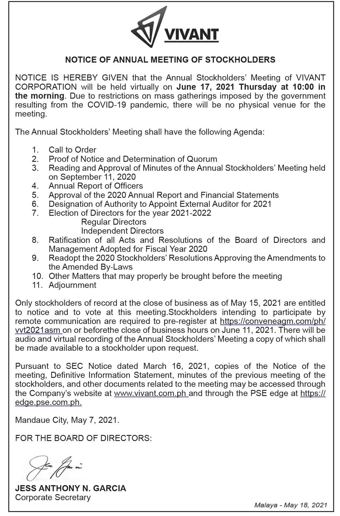 FacebookInstagramTwitterYoutube Tuesday, October 28, 2025 SEARCH Subscribe Home Business Business News World Business Corporate News Market Makers Marketing Board Shipping & Transportation News National News International News Sports Baseball Basketball Billiard Boxing Football Golf Olympics Other Sports Sea Games Tennis Volleyball Lifestyle Arts Columns Fashion Food Health Home Living Entertainment Columns Movies Music/Concert/Shows Spotlight TV/Streaming Opinion Column of the day Editorial Cartoon Editorial Opinion of the day Weekly Features Banking & Finance Torque & Power Alternative Fuel/Electric Vehicles Commercial Vehicles Luxury Cars Motorcycles Test Drives Infotech & Electronics Appliances/Electronics Constructioneering Cybersecurity/Privacy e-Commerce e-Sports/Gaming Fintech/Crypto Gadgets Imaging Printed Circuit Science and Technology Socmed Tech Industry Tech This Week Tech People Property Travel & Tourism Special Features Anniversary Issues 42nd Anniversary Section C Section D Section E Section F Section G Section H 41st Anniversary Supplement 40th Anniversary Report 39th Anniversary Report 38th Anniversary Report Supplements Branded Content Notices VIVANT: Notice of Annual Meeting of Stockholders By ___ May 18, 2021 12:00 AM Updated: May 18, 2021 12:00 AM Share FacebookTwitterPinterestWhatsApp Asia Event Group Inc. launches Aftermarket Expo Asia 2025: A premier platform for innovation and growth in the automotive sector October 2, 2025 Fight vs. illegal gambling gets boost with ₱50M PAGCOR grant to NBI October 2, 2025 NUSTAR Online joins as major sponsor of RED Charity Gala 2025, championing fashion, philanthropy, and Filipino ingenuity October 2, 2025 Nestlé Wellness Campus promotes the importance of nutritious breakfast and healthy habits during Better Breakfast Month October 2, 2025 PlayTime CARES: Strengthening communities and supporting Government for nation-building October 2, 2025 Share FacebookTwitterPinterestWhatsApp Previous articleLong working hours are a killer, WHO study showsNext article917VENTURES boosts startups, DITO in 100 cities and municipalities, ACCENTURE funds vs covid, MEDGATE sees more teleconsultations, MASTERCARD appointment - Advertisement - - Advertisement - E-Paper More Stories NUSTAR Online joins as major sponsor of RED Charity Gala 2025, championing fashion, philanthropy, and Filipino ingenuity Nestlé Wellness Campus promotes the importance of nutritious breakfast and healthy habits during Better Breakfast Month Load more Related Stories ___ - October 2, 2025Asia Event Group Inc. launches Aftermarket Expo Asia 2025: A premier platform for innovation and growth in the automotive sector ___ - October 2, 2025Fight vs. illegal gambling gets boost with ₱50M PAGCOR grant to NBI ___ - October 2, 2025NUSTAR Online joins as major sponsor of RED Charity Gala 2025, championing fashion, philanthropy, and Filipino ingenuity Load more