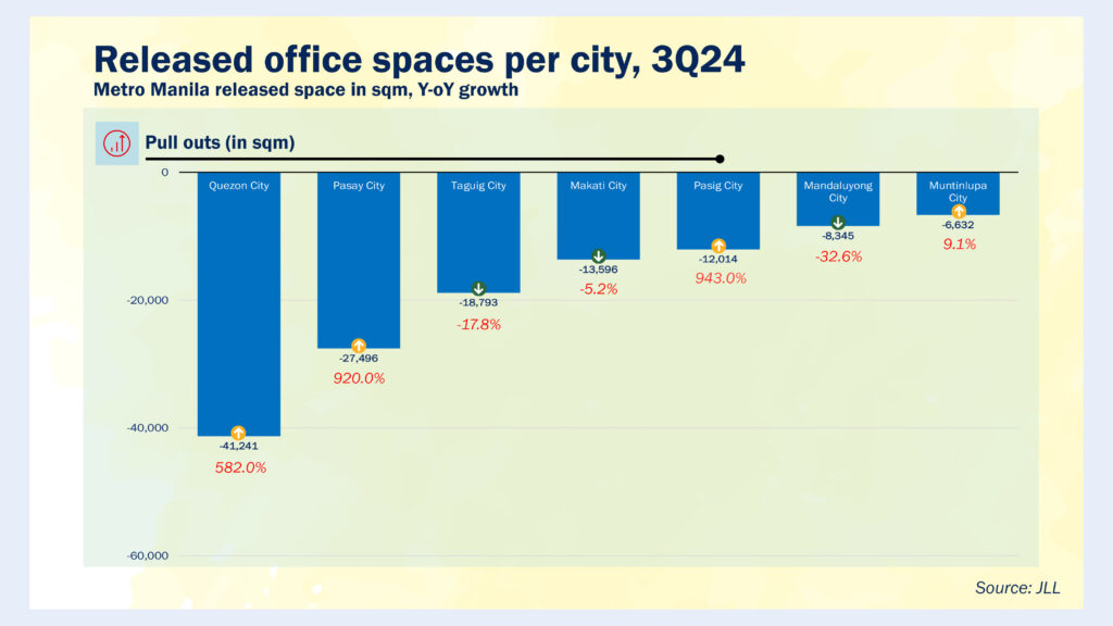 Select major pullouts are in Quezon City. A 4,300 sq.m space was vacated by a BPO firm and another 7,200 sq.m. was released by another company.