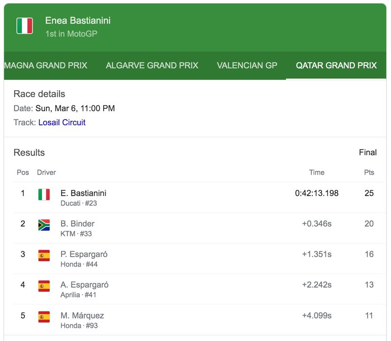 Enea Bastianini however, with the Desmosedici GP of the Gresini Racing team triumphed in Qatar. Second in qualifying yesterday and fourth after the start, the Italian rider was able to take the lead with five laps to go, creating the gap behind him necessary to secure his first MotoGP success.