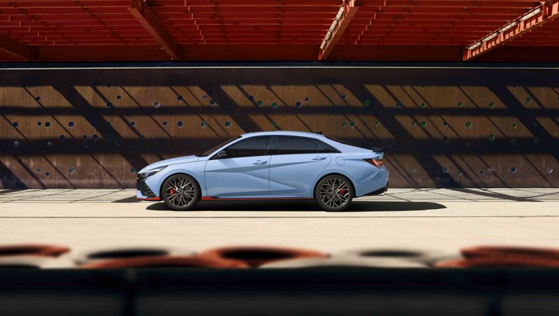 The N-exclusive red strip at the bottom of the front bumper continues along Elantra N’s side skirts, giving the hot sedan a racetrack-ready look.