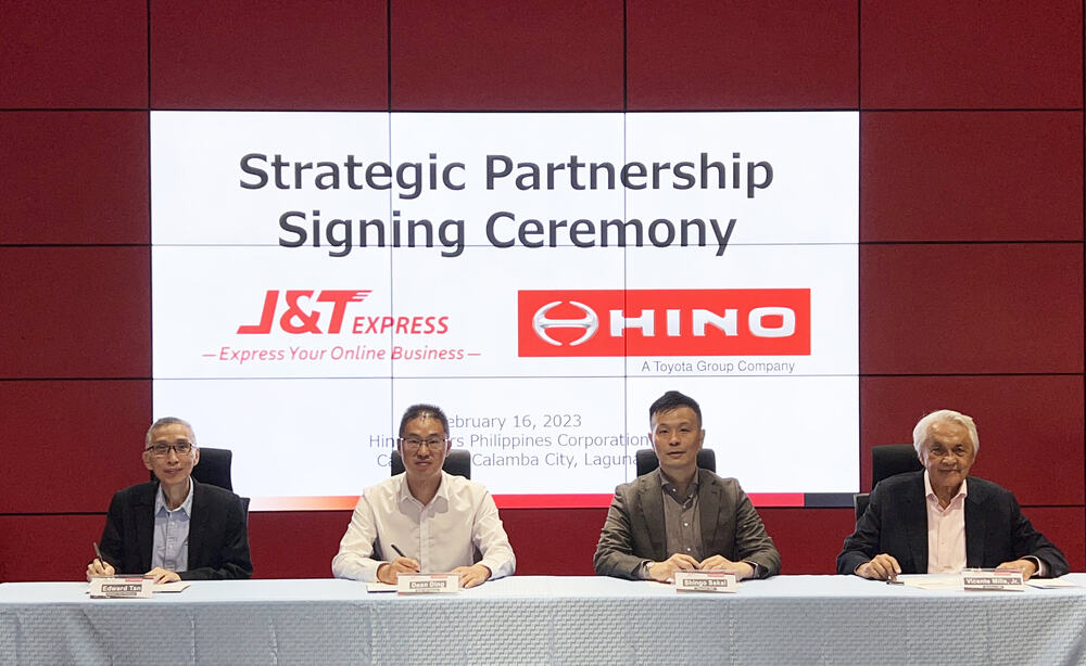 The signing ceremony held at the Hino headquarters in Calamba, Laguna on February 16 was attended by J&T Express Chief Executive Officer Dean Ding, HMP Chairman Vicente T. Mills, Jr., HMP President Shingo Sakai, J&T Express Director of Procurement Arron Wang, Director of Operations John Yi and Hino Paranaque President Edward Tan.