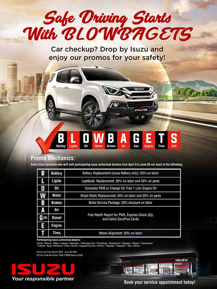 Isuzu Philippines Corporation (IPC), lets you welcome the summer season safely with BLOWBAGETS. Inspired by the popular mnemonic, IPC advocates the importance of keeping Isuzu vehicles in tip-top shape and condition under the care and expertise of its certified technicians to help further protect drivers and passengers on the road.