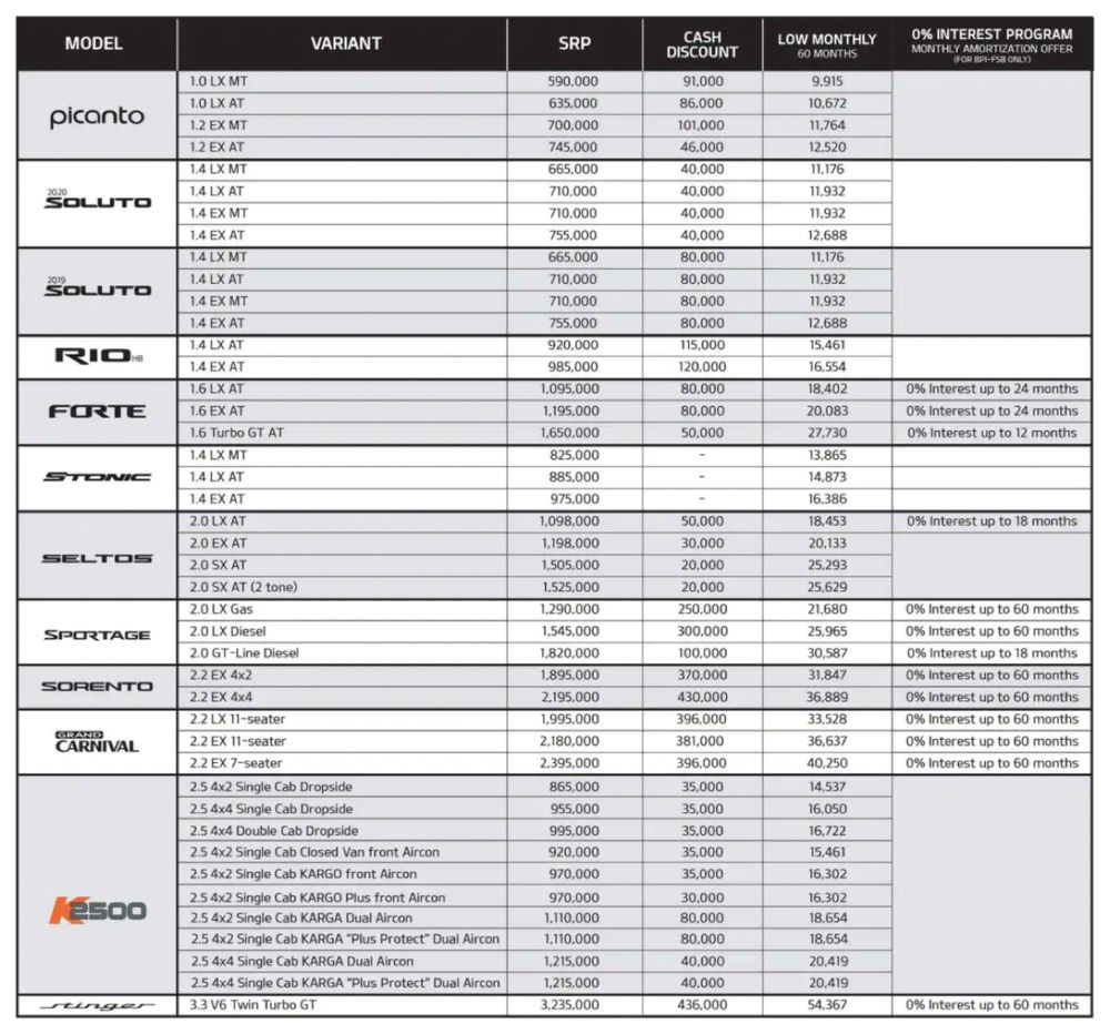 Don’t miss out on the irresistible deals available for The Picanto, Soluto, Rio Hatchback, Forte, Seltos, Sportage, Sorento, Grand Carnival, Stinger and K2500. Inquire about them through any of the authorized Kia Dealerships nationwide on or before May 31.