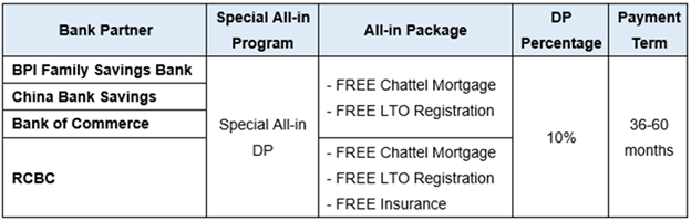 | Bank Partner | All-in Program | All-in Package | DP Percentage | Payment Term |