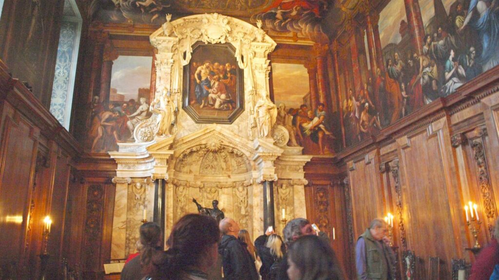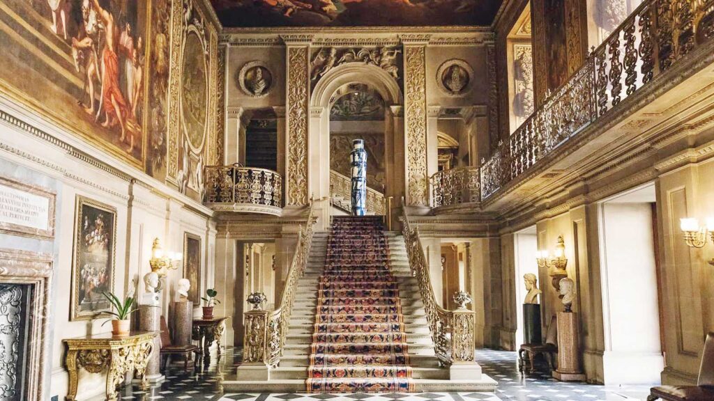 The house itself is a treasure trove of artworks spanning centuries. The Painted Hall serves as the lavish entrance of the house and features a black-and-white tiled marble floor. The painted ceiling and walls impart dramatic flair to the room and give the Painted Hall its name. It features dramatic scenes from the life of Julius Caesar.